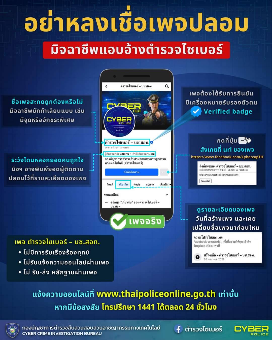 อย่าหลงเชื่อเพจปลอม มิจฉาชีพแอบอ้างตำรวจไซเบอร์