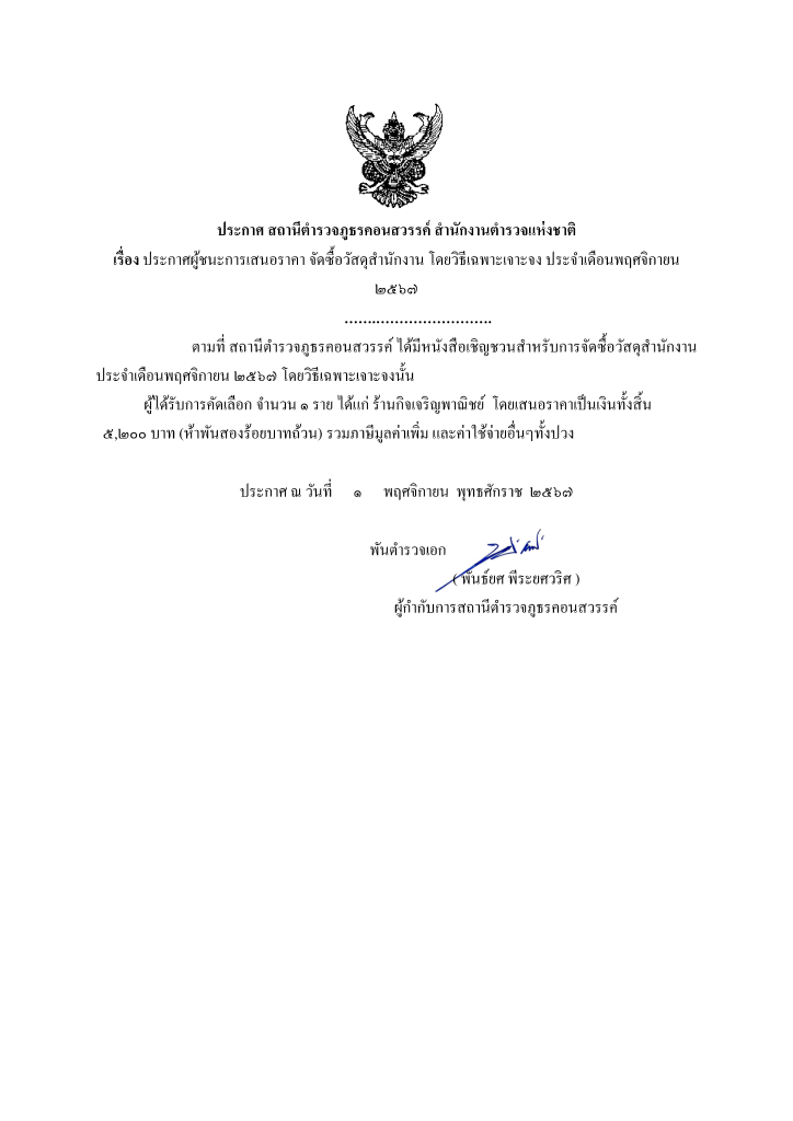 ประกาศ สถานีตำรวจภูธรคอนสวรรค์ เรื่อง ประกาศผู้ชนะการเสนอราคา ซื้อวัสดุสำนักงาน โดยวิธีเฉพาะเจาะจง ประจำเดือน พ.ย. ๒๕๖๗