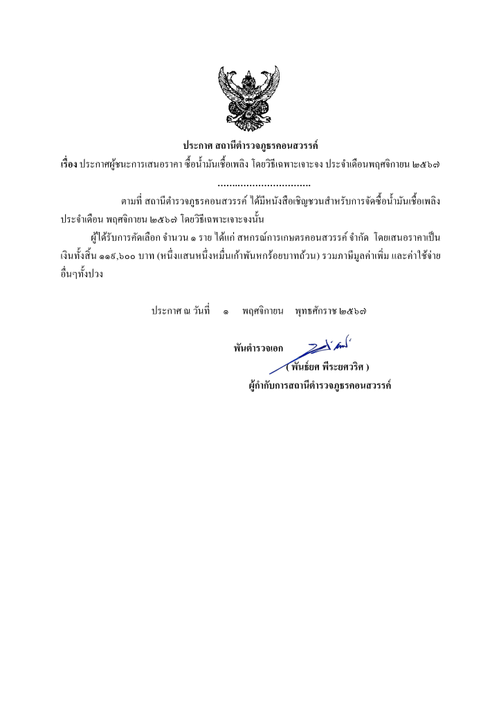 ประกาศ สถานีตำรวจภูธรคอนสวรรค์ เรื่อง ประกาศผู้ชนะการเสนอราคา ซื้อน้ำมันเชื้อเพลิง โดยวิธีเฉพาะเจาะจง ประจำเดือน พ.ย. ๒๕๖๗