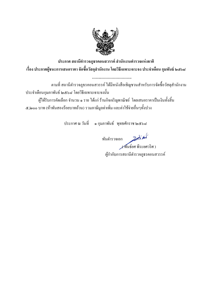 ประกาศ สถานีตำรวจภูธรคอนสวรรค์ เรื่อง ประกาศผู้ชนะการเสนอราคา ซื้อวัสดุสำนักงาน โดยวิธีเฉพาะเจาะจง ประจำเดือน ก.พ. ๒๕๖๘