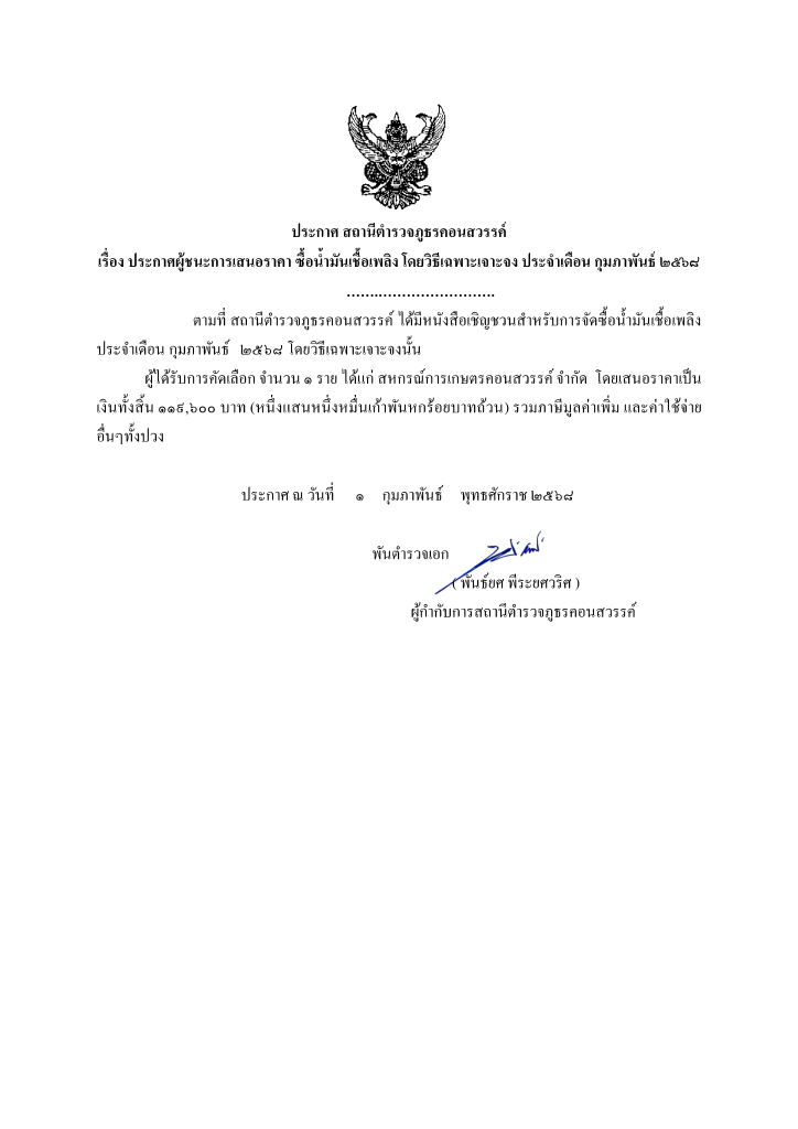 ประกาศ สถานีตำรวจภูธรคอนสวรรค์ เรื่อง ประกาศผู้ชนะการเสนอราคา ซื้อน้ำมันเชื้อเพลิง โดยวิธีเฉพาะเจาะจง ประจำเดือน ก.พ. ๒๕๖๘