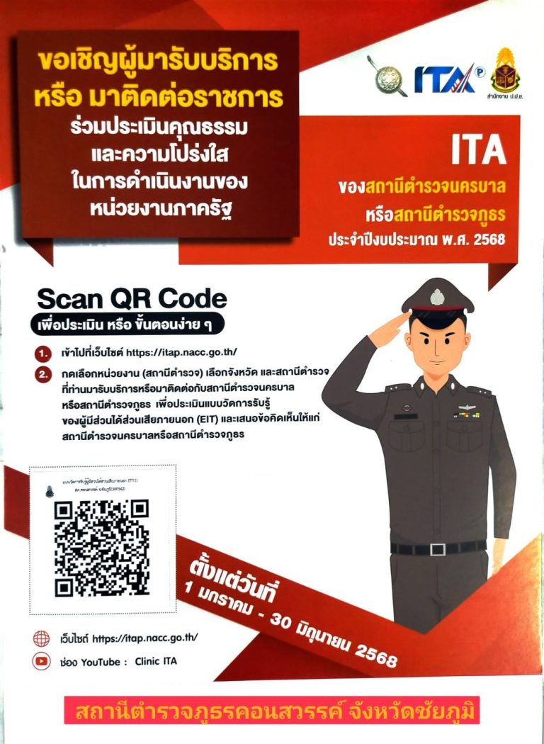 ขอเชิญผู้มารับบริการ หรือติดต่อราชการร่วมประเมินโดยการคลิกที่ภาพ หรือแสกน QR CODE ตั้งแต่ 1 ม.ค. – 30 มิ.ย. 2568